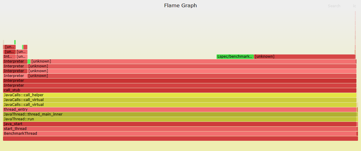 如果使用 Perf-map-agen 时不设置 XX:+PreserveFramePointer 保留帧指针的话,火焰图只会显示栈顶的函数,如图 5 所示,但开启后会额外带来性能损失,同时开启 Perf-map-agen&PreserveFramePointer 的得分下降了 9%。我这里缺失了单独开启 PreserveFramePointer 的性能实验,不过根据 Netflix 的报告(https://netflixtechblog.com/java-in-flames-e763b3d32166),性能损耗在 0 到 3% 左右。