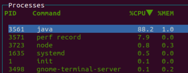可以看到,如果使用 Perf,对性能的影响是很高的,通过 sar -u 命令,在使用 Perf 采样 SPECjvm 时,%user 为 91.7%,%system 为 7.81%,作为对比,与未使用 perf 时运行 compress 用例的 %user 为 99.09%,%system 为 0.17%。使用 Perf 采样 SPECjvm 时 CPU 占用比例如下: